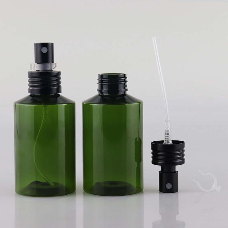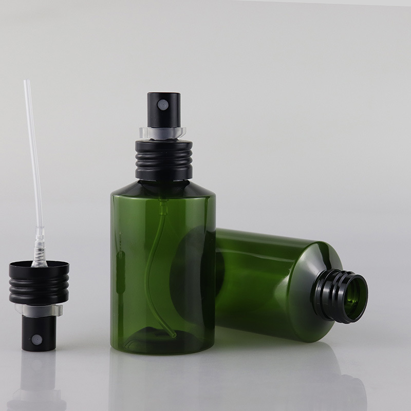 100ml 3.3oz Green oblique shoulder round bottle with 24-410 black aluminum mist sprayer Neck:24/410 Volume:100ml(family bottle:50ml,100ml,200ml and 500ml) MOQ: 10000PCS Color:Color can be customed Material: Food Grade PET