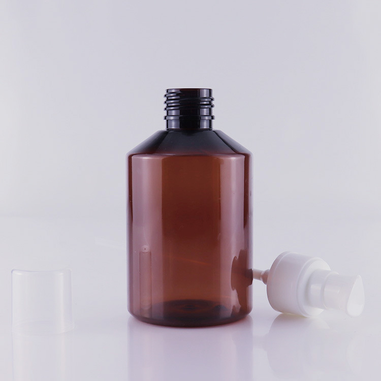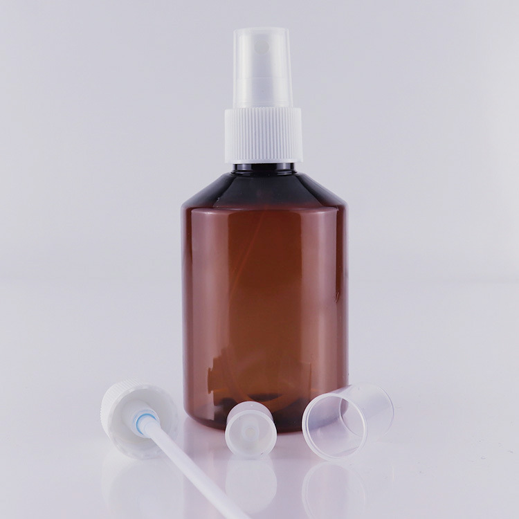 200ml 6.7 Amber oblique shoulder round bottle with 24-410 msit sprayer Neck:24/410 Volume:200ml(family bottle:50ml,100ml,200ml and 500ml) MOQ: 10000PCS Color:Color can be customed Material: Food Grade PET