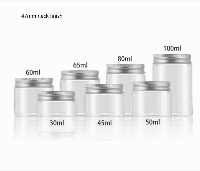 50ml,60ml,80ml,100ml and 120ml Family Jars with PP lids for eye cream, body butter, facial cream Neck:56-400 Material:PET Jar base and PP Lids Volume:50ml,60ml,80ml,100ml,120ml Color: any color
